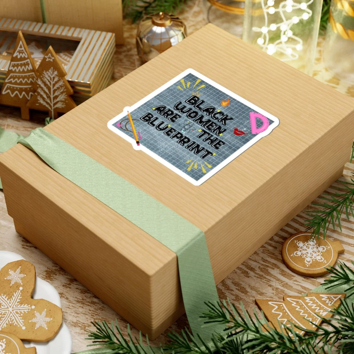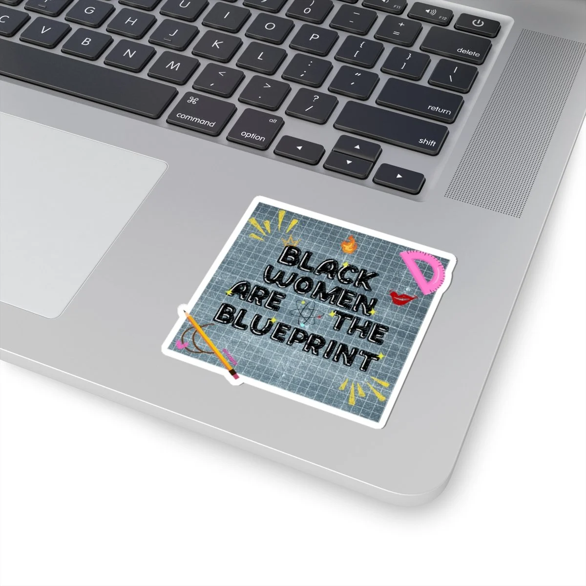 A bold, glossy vinyl sticker that celebrates Black women with playful school-inspired graphics. The design layers chunky, handwritten-style lettering — "BLACK WOMEN ARE THE BLUEPRINT" — over a faint grid blueprint background, punctuated by bright doodles: a pink protractor, pencil, sparkles, and a tiny atom symbol. Stick it on a laptop, journal, or planner to bring a bit of confident energy and cleverness to your everyday gear.