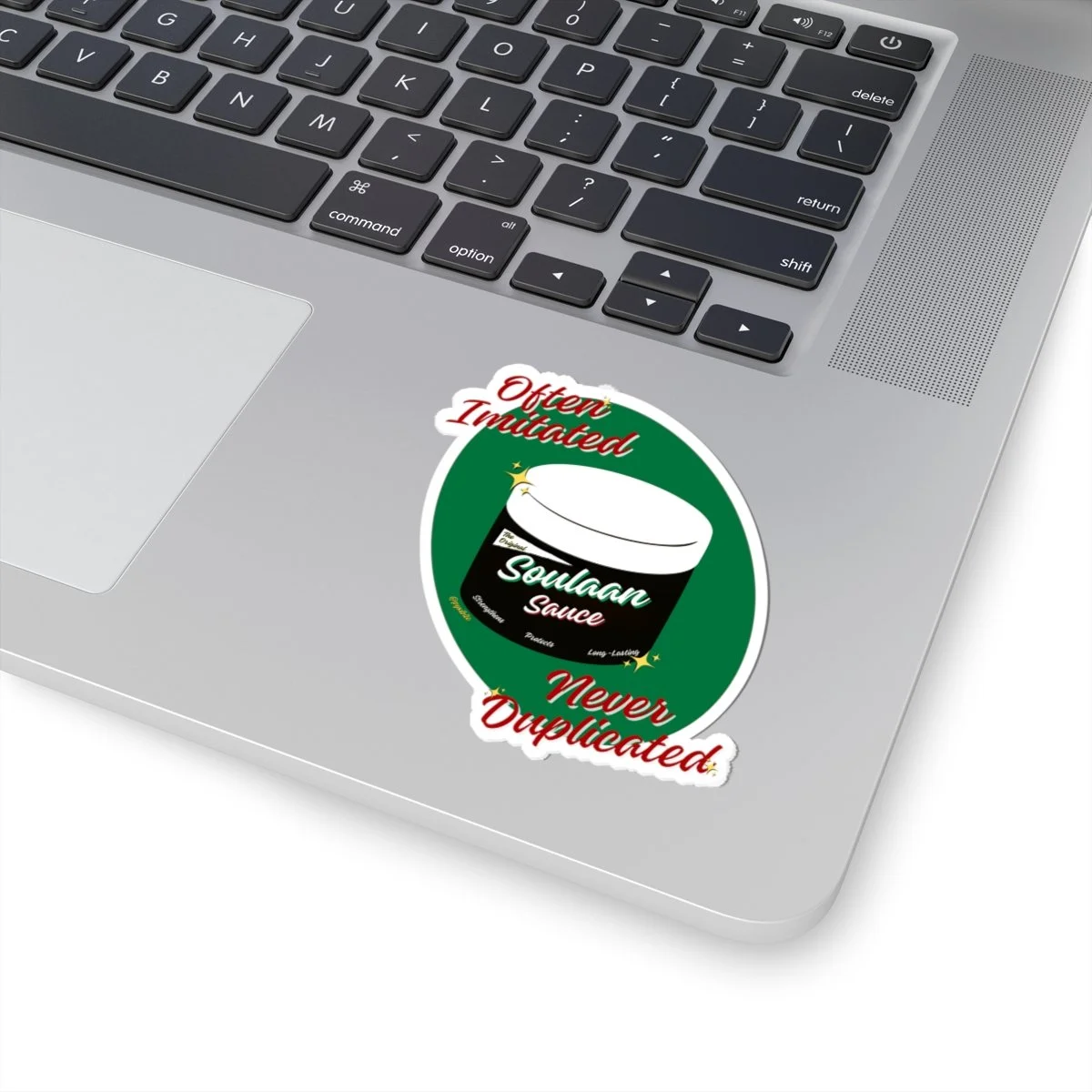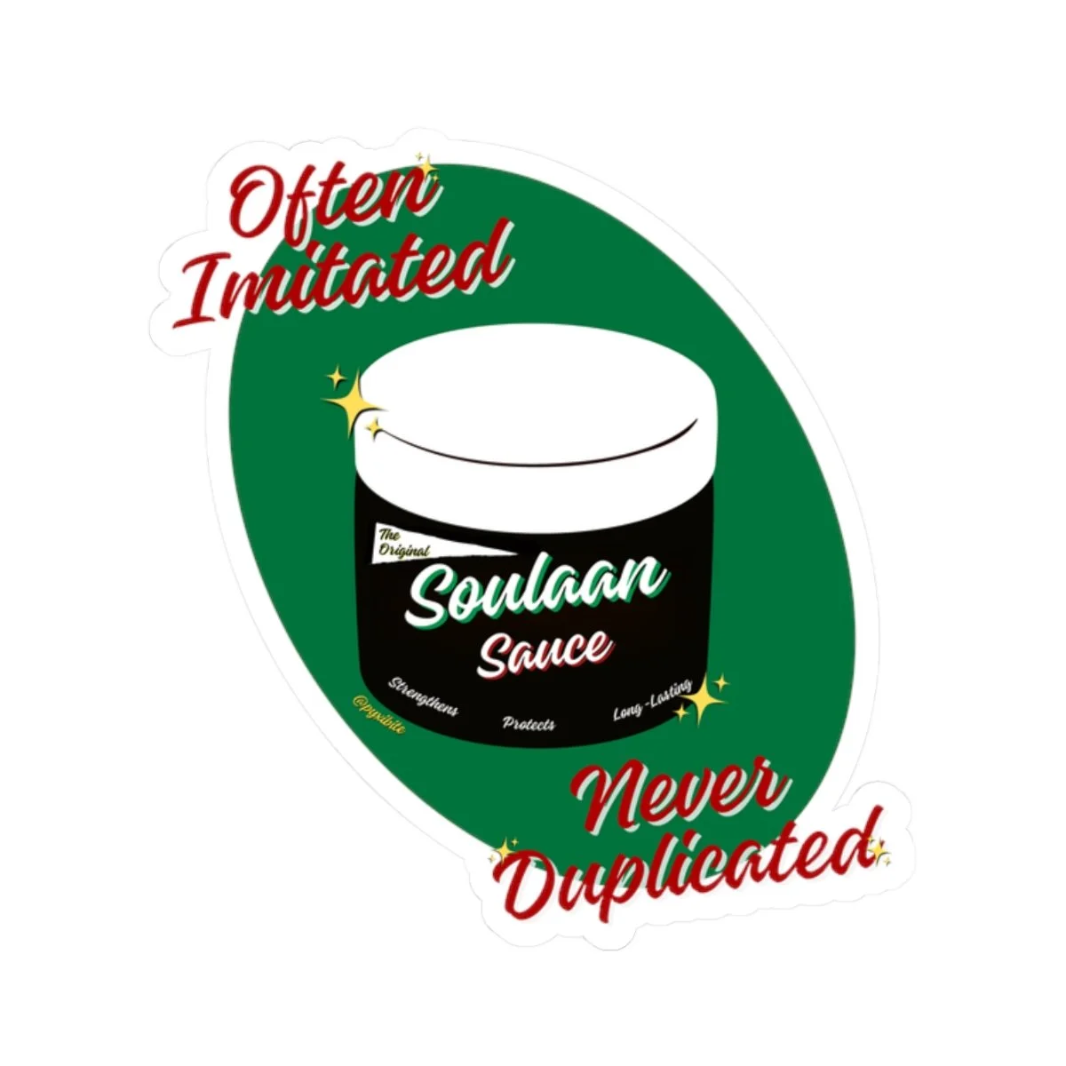 This sticker brings personality and bold color to laptops, journals, water bottles, or any smooth, flat surface. The design centers on a stylized jar with a deep green backdrop and energetic red script declaring “Often Imitated, Never Duplicated,” giving the sticker confident, cheeky energy.