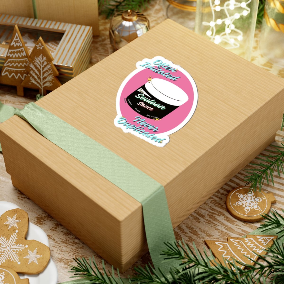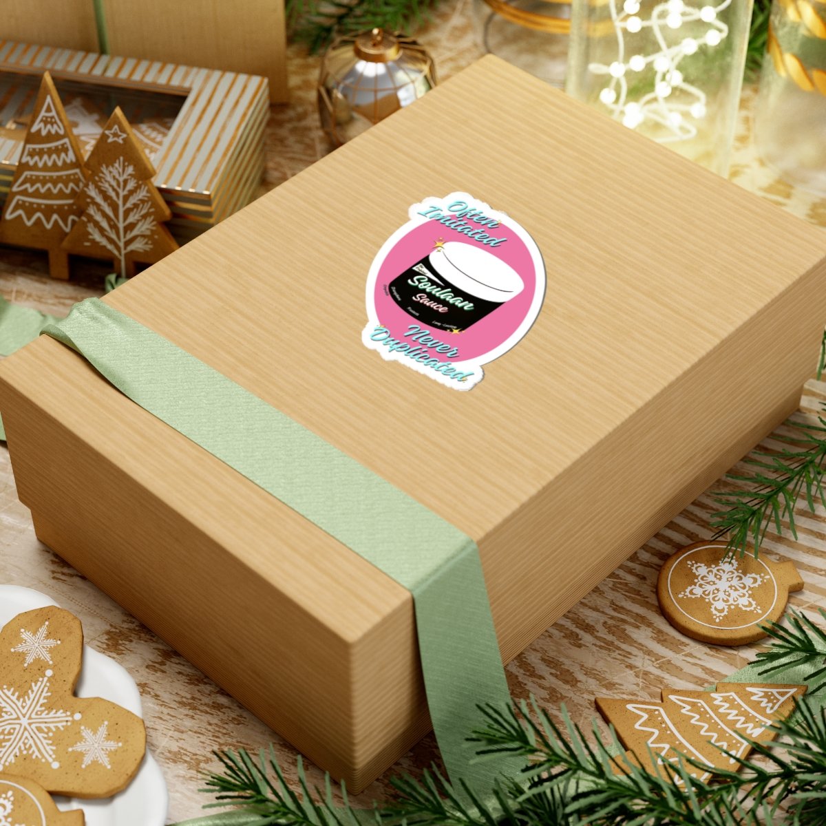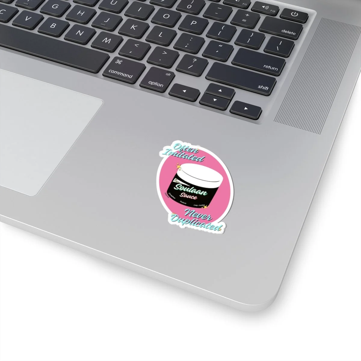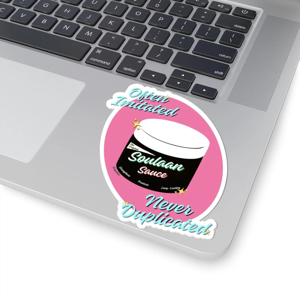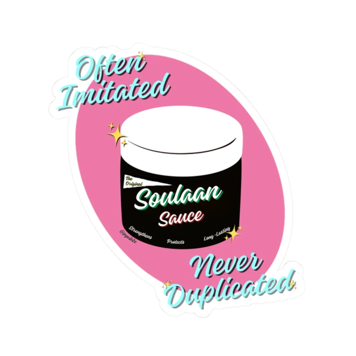 Asticker celebrating originality with playful, retro vibes. The design centers on a stylized jar labeled “Soulaan Sauce” set against a warm pink oval, framed by hand-lettered script that reads “Often Imitated Never Duplicated”. Bright aqua and cream lettering, tiny sparkle accents, and a crisp white cut outline give the sticker a pop that stands out on laptops, journals, water-bottles, or phone cases.